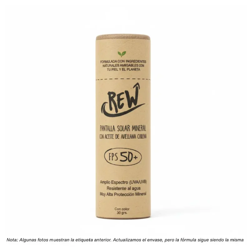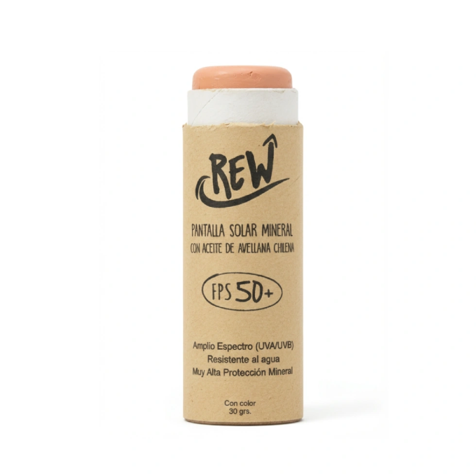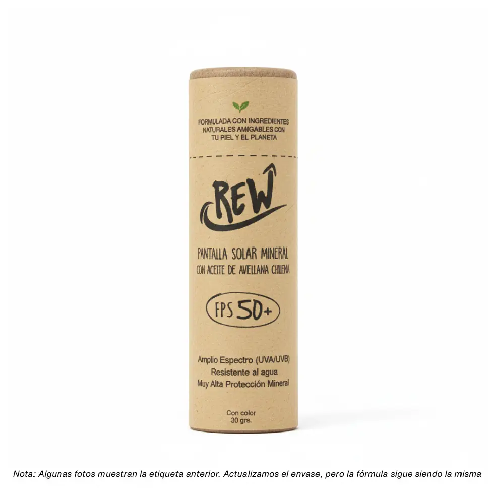 Por eso creamos Rew: una pantalla solar 100% mineral y natural, hecha con ingredientes como aceite de avellana chilena, cera de candelilla y aceite de coco.