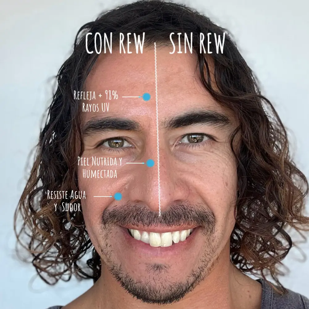 Rew refleja el 98% de los rayos UV desde el primer segundo que te la aplicas. Formulada con óxido de zinc sin nanopartículas, crea un escudo protector contra los rayos UVA y UVB sin esperar 20 minutos de activación como los protectores químicos.